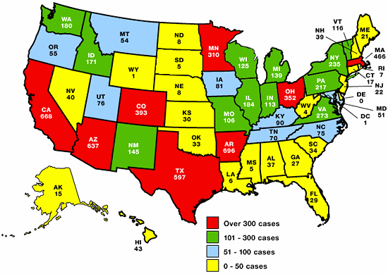 Both maps display concentrations of disease in southern border states, other east coast ports of entry, and selected other areas. There isn’t an environmental factor, such as stronger solar ultraviolet radiation, or water, or lifestyle that can explain these geographical similarities. Another map, involving geographical concentrations of Hepatitis A cases, also looks surprisingly similar. Here is that map for your viewing.