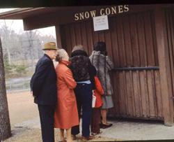 One of my favorites is shown here. The people in the photograph are my wife, two of my children, and my parents. We were at the St. Louis Zoo on a beautiful but chilly winter day, probably about twenty-five years, or more, ago. Strolling past the shuttered Snow-Cone stand, we noted the sign, which you may be able to read for yourself, perhaps, if you can enlarge the photo. It says, "Please form a line for better service." So we formed the line shown.