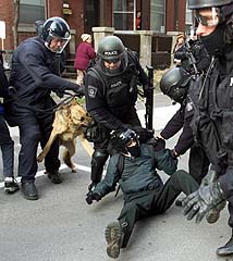 Overkill is always the first option: Sure, they’re heavily armed and already outnumber the protester, by why shouldn’t the riot police let their attack dog have a little fun, too?
