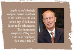 The acerbic international investor unflatteringly compares current conditions in the United States to both the last days of the Roman Empire and to chimpanzees. Like chimpanzees everywhere, if they can’t trade for it, they’ll have their armies take it, Casey said.