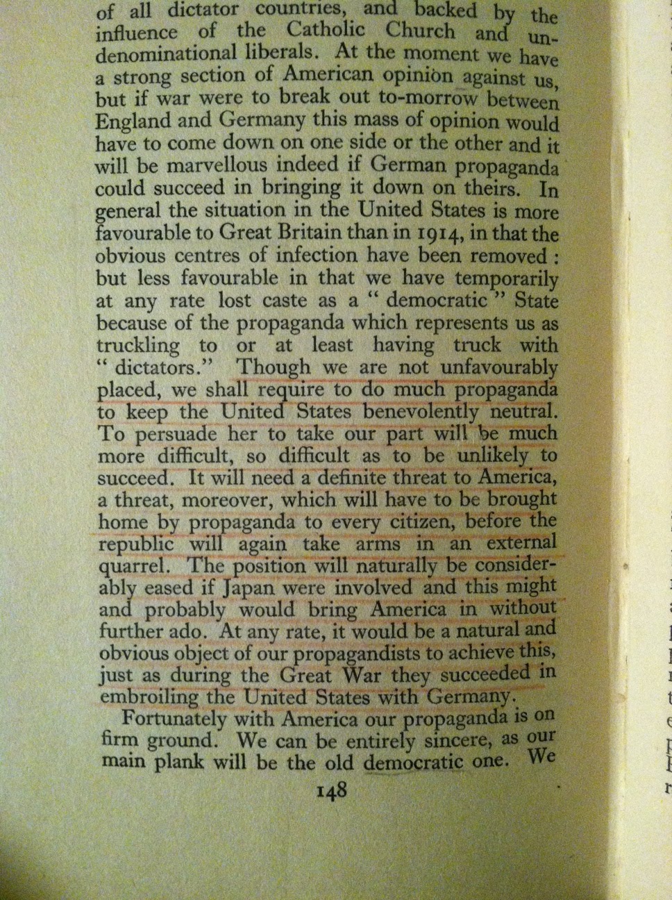 With that kind of publicity experience, it appears that Rogerson was the Don King of British military propaganda. What’s interesting, is what Rogerson wrote on Page 148 of Propaganda in the Next War that, again, was published in London…3 years before Pearl Harbor. Sidney Rogerson wrote: “Though we are not unfavourably placed, we shall require to do much propaganda to keep the United States benevolently neutral. To persuade her to take our part will be much more difficult, so difficult as to be unlikely to succeed. It will need a definite threat to America, a threat moreover, which will have to be brought home by propaganda to every citizen, before the republic will again take arms in an external quarrel. The position will naturally be considerably eased if Japan were involved and this might and probably would bring America in without further ado. At any rate, it would be a natural and obvious object of our propagandist to achieve this, just as during the Great War they succeeded in embroiling the United States with Germany.”