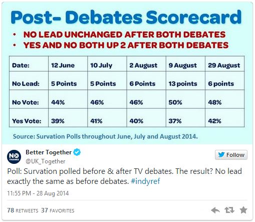 This is the first survey after the final TV debate between Alex Salmond, the leader of the pro-independence Scottish National Party, and Alistair Darling, the head of the anti-independence “Better Together” campaign.