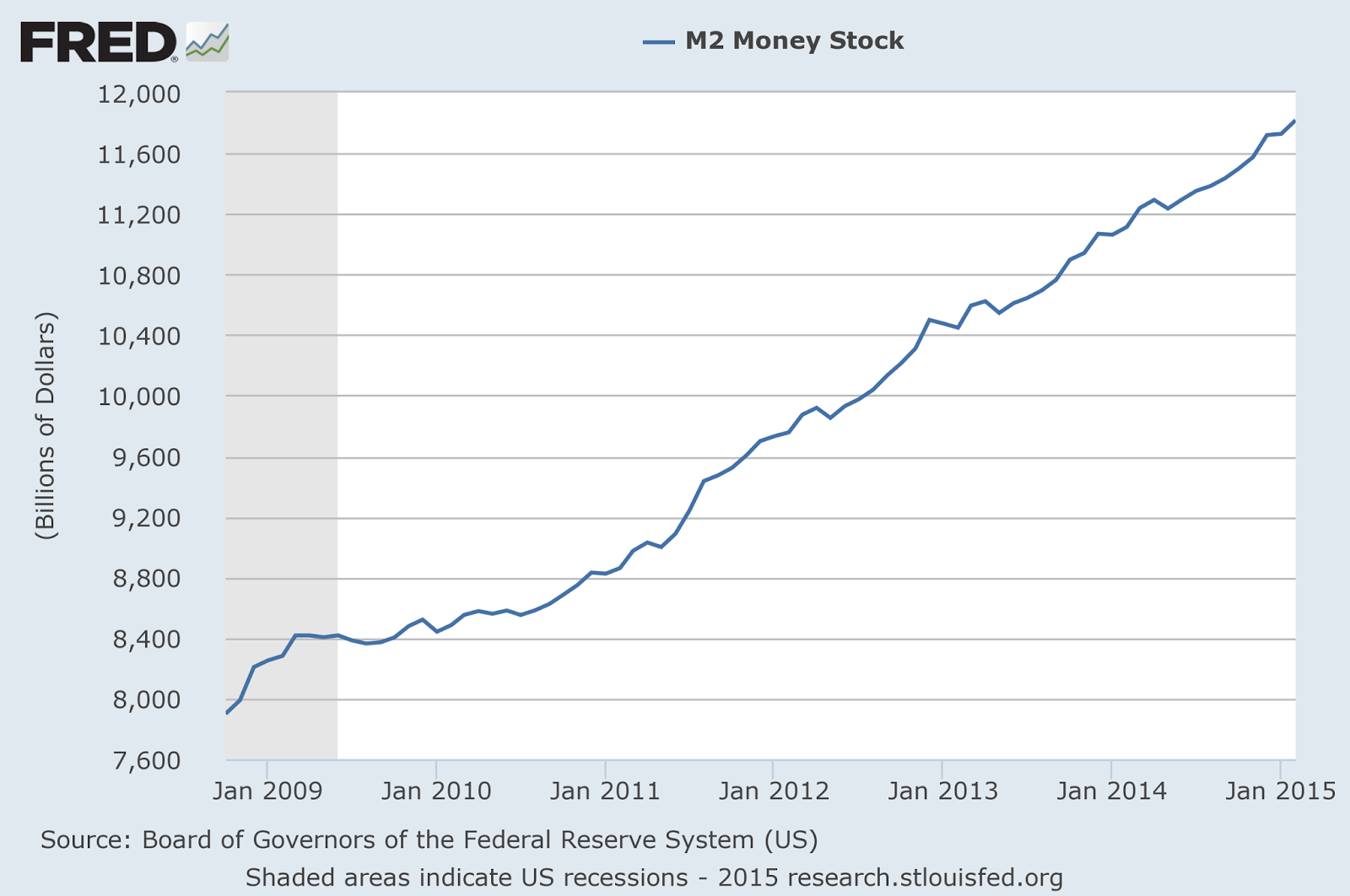 He holds this view despite the fact that the money supply has grown by near 50% , since the interest rate controlled by the Fed, the Fed Funds rate, has been near zero.