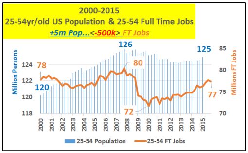 Over the last 16 years, the percentage of 25 to 54 full-time employed Americans has fallen from 65% to 62%. I guess people are retiring much younger if you believe the MSM storyline. Over this same time period, the total full-time employment to population ratio has fallen from 53% to 48.8%. The overall labor participation rate peaked in 2000 at 67.1% and stayed steady between 66% and 67% for the next eight years. But this disguised the ongoing decline in the participation rate of men.