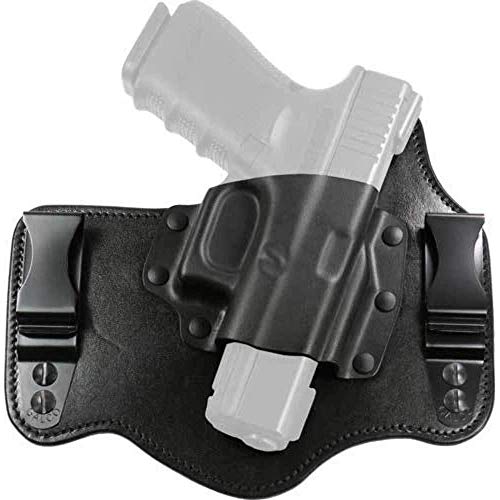 The holster itself has a hybrid design with a large leather back panel and two metal belt mounting clips. The gun pocket is made of Kydex and perfectly fitted to the gun model in question.