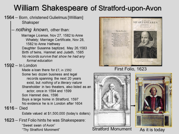 Records show the Stratford William first in London in 1592, age 28, when he made a £7 loan to someone there. Around two-dozen business and legal records spanning the next 20 years show him to be a trader in grain; a money lender; land owner; a shareholder in two public theaters, Blackfriars and Globe; and possibly also a part-time actor. He was a successful businessman and in 1597 purchased the largest domestic house in Stratford, with 30 main rooms. He died in 1616 at age 52, with an estate worth $1,500,000 (in today’s dollars). [1]. Nothing exists from during this person’s lifetime that indicates he might have been a writer.