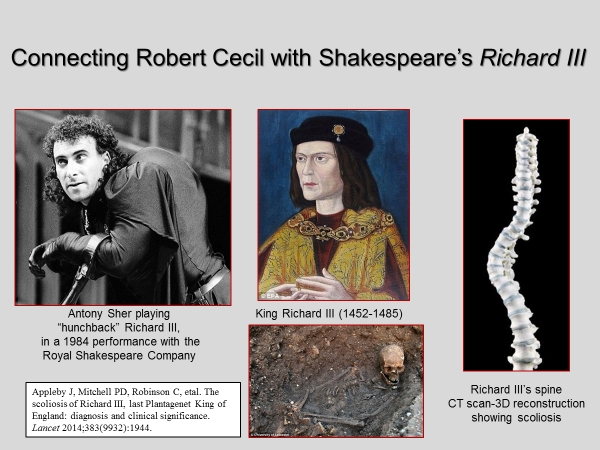 Edward de Vere didn’t help matters when he turned Richard III into a hunchback, describing him in the play as “this poisonous bunch-backed toad” (I,iii,241-45). Connecting Robert Cecil in this manner with a said to be evil Richard III was not lost on the play’s London audience. (There is no reference to Richard having any deformities in a much earlier version of the play, The True Tragedy of Richard III, that de Vere wrote when he was a teenager. [8]) Cecil got even. He eradicated Oxford’s literary paper trail and largely airbrushed him out of history.