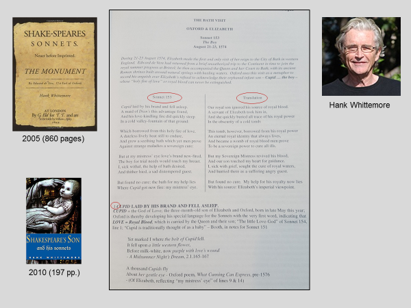 With de Vere established as Shakespeare, a concise coherent theory on the matter needs to make sense of Shake-speare’s Sonnets. Oxfordian researcher Hank Whittemore has done that in The Monument (860 pages), published in 2005. He analyzes each line in the 154 Sonnets and the key words in each line.