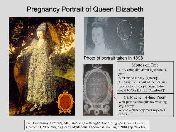Along with other features of a symbolic nature, the cartouche on the bottom right contains a 14-line Shakespearean sonnet, where de Vere describes the Queen’s pregnancy by him and his sadness over the loss of his son to her royally-commanded foster parentage. Its various owners have had approximately 30 percent of the portrait painted-over to cover-up the subject’s identity. A photograph of the painting taken in 1896 shows a capital “R” for Regina on her upper veil that has been erased.