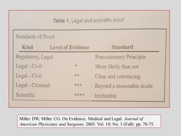 - Miller DW, Miller CG “On Evidence, Medical and Legal.” Journal of American Physicians and Surgeons 2005;10(3):70-75. Available at: http://www.jpands.org/vol10no3/miller.pdf