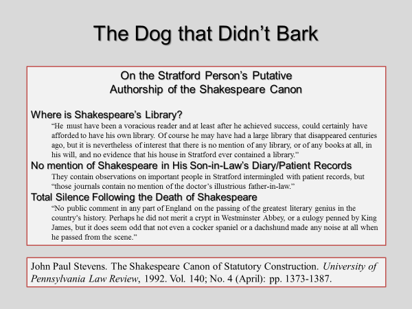 Five years later, in the University of Pennsylvania Law Review, Justice Stevens observed that three parts of the case are analogous to Arthur Conan Doyle’s dog that didn’t bark (in Silver Blaze, where Sherlock Holmes discerns that the guard dog’s silence indicates it knew the thief who came into the barn and stole a prized horse).