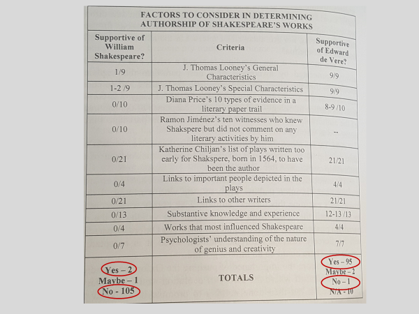 Only 2 of these 108 factors support Stratford’s William Shakespeare for authorship of the canon, while 95 of the 98 applicable factors back Edward de Vere as the true author!