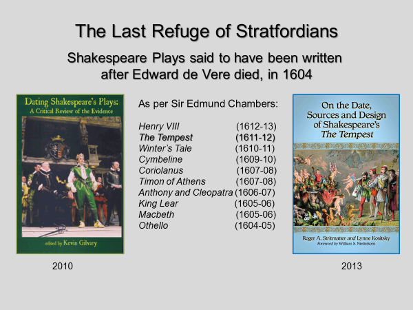With no surviving manuscripts, Stratfordians have labored to ascertain when (the Stratford) Shakespeare wrote his plays. They must fit up to 40 plays into a 26-year time frame, from 1590 (starting at age 26) to 1616 (the year he died). They cite Sir Edmund Chambers “definitive” 1930 study where he concludes that 10 plays were written after 1604, the year de Vere died. Stratfordians point especially to The Tempest, said to be inspired by the shipwreck of the Sea Venture that occurred near Bermuda in 1609.