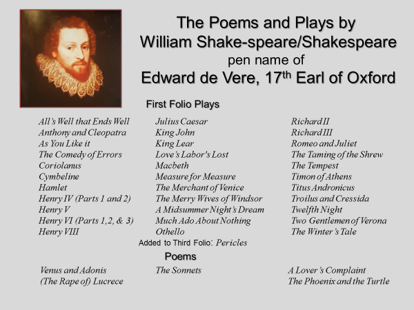 100 Reasons Shake-speare was the Earl of Oxford (2016, 351 pp.) by Hank Whittemore. He nails it! He proves beyond a reasonable doubt de Vere is Shakespeare.
