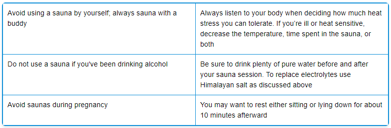 If you’ve never taken a sauna before, start out by spending only four or five minutes in there and work your way up to somewhere between 15 to 30 minutes. You will lose important body electrolytes when you do a sauna so it is important to make sure you supplement with extra salt. Either salt your food more, or put a half-teaspoon of Himalayan salt in 2 ounces of water and flavor it with lemon or lime juice and use it as salt shot.