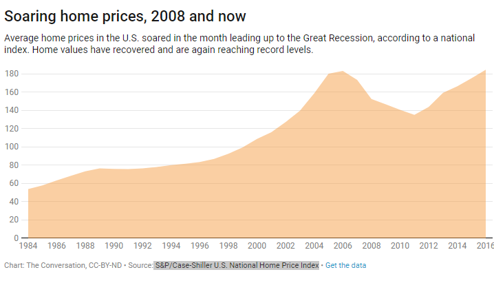 Skyrocketing housing prices in the mid-2000s outstripped stagnant incomes. That drove banks to come up with more and more creative financing options so people could continue to buy homes. People were taking out risky mortgages that they would never be able to pay back.