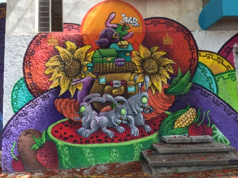 Recently Vi and I were in Tuxtla Gutierrez, Chiapas in southern Mexico and, wandering about in a sort of Brownian motion, found ourselves walking along a canal. We discovered a region frequented by grafiteros, street artists.These view unwatched walls as canvases, legal, semi-legal or just not policed. Using spray paint, they, well, paint. I suspect that the authorities fail to get into an uproar because the results leave the precincts more attractive than would bare walls. Vandalism it isn’t.