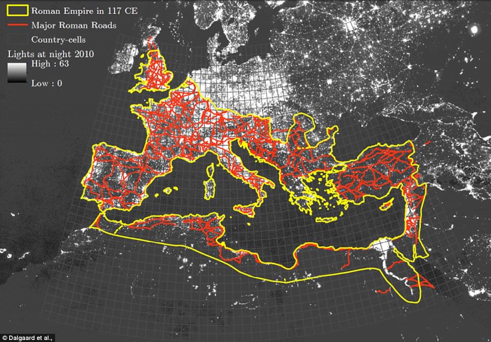 Satellite images show lights from prospering towns surrounding Roman roads that were built 2,000 years ago.