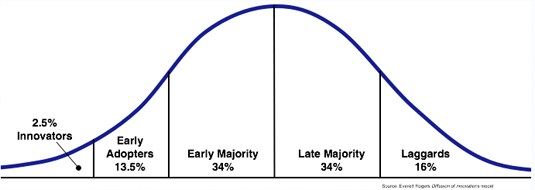 That idea is expounded upon by Geoffrey Moore which describes ‘The Chasm’ between the Early Adopters and the Early Majority. As it applies to getting through “The Chasm” Chris Maloney argues the marketing has to change in order to breach the chasm between the two demographics.