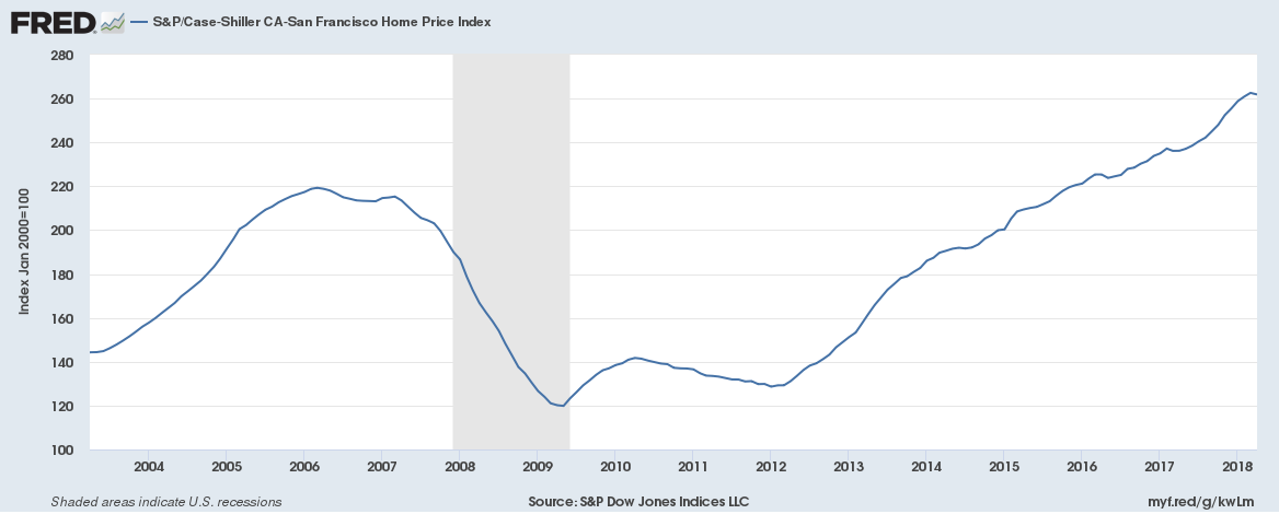 For example, in “yellow” San Francisco, where the median home now costs $1.6 million, prices are well-above the excesses seen during the previous housing bubble: