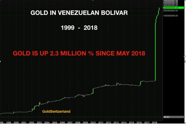Take for example the VAT countries. Not Value Added Tax, but Venezuela, Argentina, and Turkey. Deficits, debts and currency collapse are the normal warning signals and these are certainly present at varying degrees in the VAT countries. As always, the best single indicator which reveals these problems is of course gold. As the chart below shows, gold in Venezuelan Bolivars is going up exponentially. Since May 2018, gold has gone up 23,000x or 2.3 million percent.