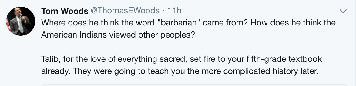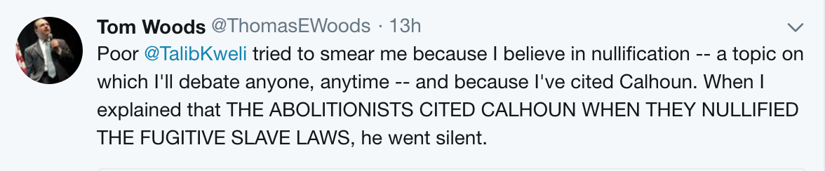 At one point Talib posted a screenshot — not of any of my books, of course, which he’s never read — of Boot’s article in which the latter criticized my view that the states had the power to nullify unconstitutional federal laws. Boot never brought up Thomas Jefferson or the Kentucky Resolutions of 1798, in which that power is clearly promoted and defended, so I mentioned them to Talib on Twitter.