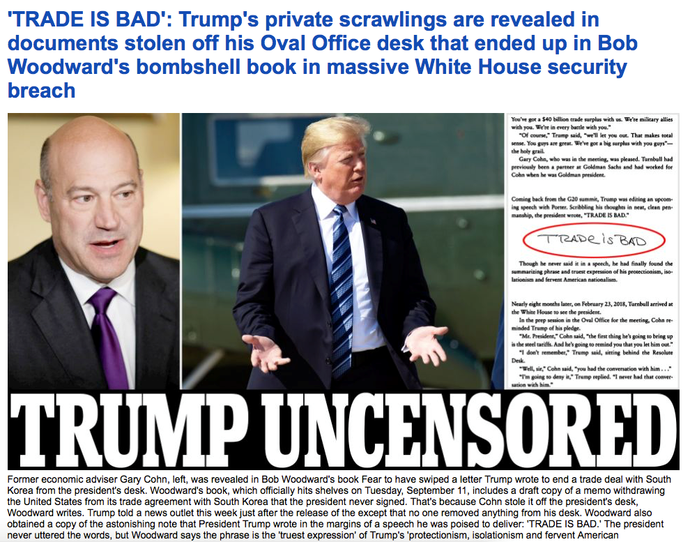 Former economic advisor Gary Cohn swipes notes that President Trump made from his desk and gives them to reporter Bob Woodward of Watergate fame that Woodward then uses to promote his new book entitled FEAR.