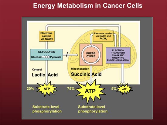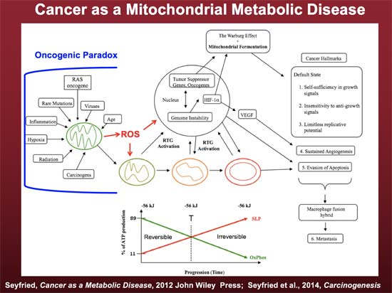 Following in Warburg’s footsteps, research by Seyfried and others show that cancer is primarily a metabolic disease involving disturbances in energy production through respiration and fermentation in the cells. Studies have actually shown that cancer is suppressed when the nucleus from a tumor cell is transferred to cytoplasm of normal cells with normal mitochondria.