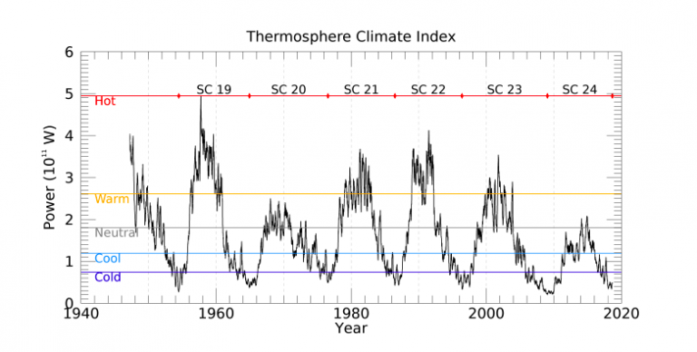 Below is a historical record of the Thermosphere Climate Index. Mlynczak and colleagues recently published a paper on the TCI showing that the state of the thermosphere can be discussed using a set of five plain language terms: Cold, Cool, Neutral, Warm, and Hot.