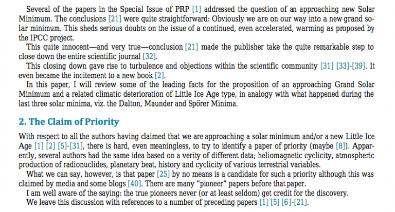 Durinng the last three grand solar minima…global climate experienced Little Ice Age conditions. Arctic water penetrated to the south all the way down to Mid-Portugal, and Europe experienced severe climatic conditions…The Arctic ice over exapanded significantly…By 2030-2040, we will be in a New Grand Solar Minimum, which by analogy to past minima must be assumed to lead to significant climatic deterioration with ice expansion in the Artctic..We now seem to be in possession of quite convergent data…This precludes a continual warming as claimed by the IPCC project, instead of this, we are likely to face a new Little Ice Age.