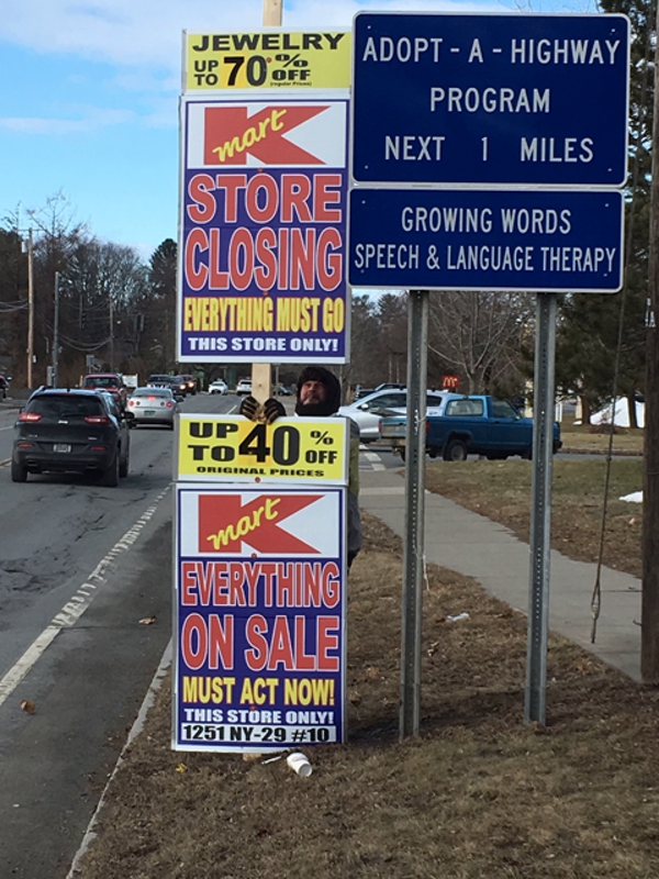 France has its Yellow Vests. Here in USA, we have a few poor shlubs hoisting the “Going Out of Business” signs on the highway in front of the K-Mart. The store in my little flyover town in upstate New York announced that it would shutter in March, and the sign-hoisting shlubs appeared out on Route 29 the first Saturday in January, an apt kick-off to a nervous new year. K-Mart’s parent company, Sears, is moving into liquidation, meaning anything that’s not nailed down must be converted into cash to pay off its creditors.