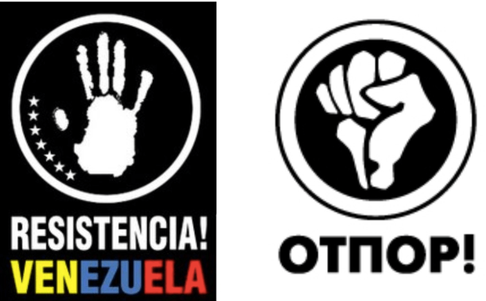 Flush with cash from libertarian oligarchs and US government soft power outfits, the radical Venezuelan cadre took their Otpor tactics to the streets, along with a version of the group’s logo, as seen below: