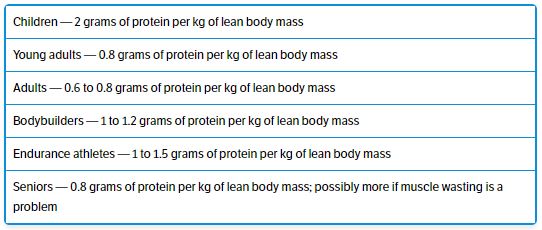 Now, when calculating your protein needs, it’s important to make the calculation based on grams per kilograms (kg) of lean mass, not total body weight. The reason for this is because you do not need protein to maintain your fat mass. You need it to maintain your lean muscle mass. The following amounts can be used as a general guideline: