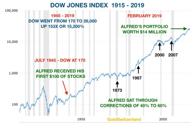 Why should we time the stock market when it works so well for us. Let’s take the example of a stock market investor called Alfred who was born at the end of WWII and is now 74 years old. At his birth, his grandparents gave him $100 of stocks in the Dow Jones index and between the parents and grandparents $10 was saved monthly to buy stocks for Alfred. All the money went into Dow stocks and dividends were reinvested. By the time Alfred was 24, in 1969, he started working and earned a good salary since he had an excellent education. So he could save $250 per month. Ten years later Alfred had done well in his career and could save $2,000 per month until his retirement at 65 in 2010. His investment account had by that time grown to $6.7 million. He continued to be fully invested in the market from 2010 and saved $1,000 per month of his pension until today. By February 2019, Alfred has amassed a stock portfolio worth $14 million. Alfred had excellent tax advisors so he could avoid capital gains taxes or other taxes on his investments.