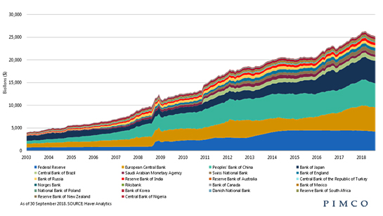 After all, at the beginning of the chart below (2003), the combined central bank balance sheet was about $4 trillion, representing 10% of world GDP of $39 trillion. By contrast, today, the $25 trillion of central bank footings amount to more than 31% of global GDP.