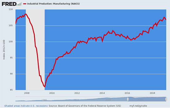 Alas, that has not happened. The physical volume of manufacturing output in February 2019 was no higher than it was in March 2007!
