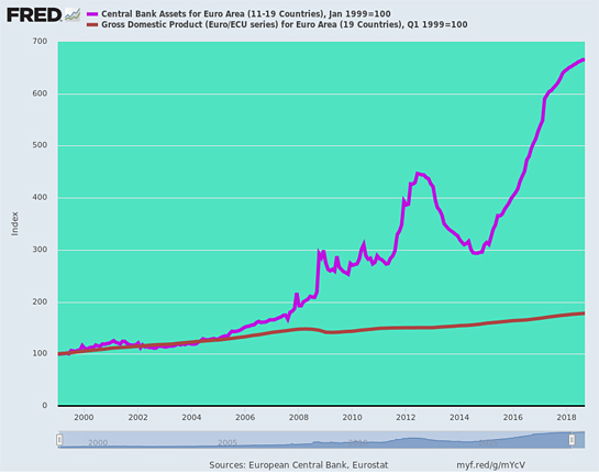 Here is the same picture for the ECB and the eurozone GDP. That is, since 1999 the ECB’s balance sheet is up by 575% compared to a 77% gain in nominal GDP.