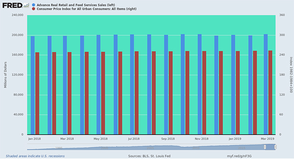 So how in the world could even the one month blip in March 2019 sales to $202.269 billion be described as a barn-burner when it was well below last October’s level, and that’s before you factor in inflation?