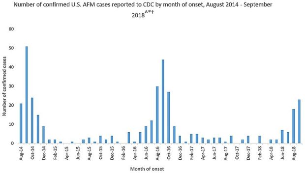 “AFM is a rare, but serious condition that affects the nervous system. It specifically affects the area of spinal cord called gray matter and causes muscles and reflexes to become weak. In most cases, the patient’s arms or legs become weak, similar to the results of infection with polio. In some cases, patients recover quickly. In other cases, patients remain paralyzed. There is a lot we don’t know about AFM, and I am frustrated that despite all of our efforts, we haven’t been able to identify the cause of this mystery illness,” said Dr. Nancy Messonnier, director of the CDC’s National Center for Immunization and Respiratory Diseases.