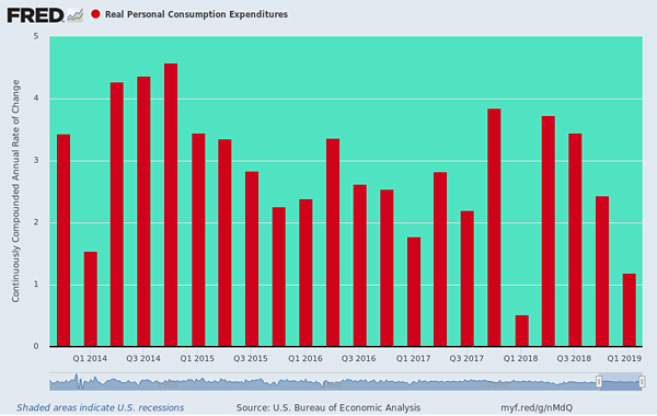 In this context, here is the profile of America’s vaunted shop-until-they-drop consumer. The tiny 1.19% annualized rate of gain in Q1 was the second weakest consumer showing since late 2013, and down from 3.8% in Q2 2018, 3.5% in Q3 and 2.5% in Q4.