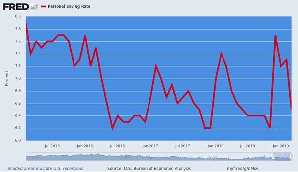 This was evident again in March when the savings rate dropped to a rock bottom 6.5%. What this means, of course, is that even the weak spending trend evident since last year’s Q2 sugar high has been flattered by the drainage of savings accounts.