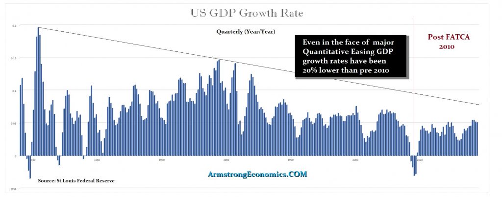 It was Obama who pushed FATCA (Foreign Account Tax Compliance Act) that requires all foreign entities to report on anything they do with Americans outside the USA or else their assets will be confiscated in the USA. The FATCA legislation was passed into law in 2010 as part of the unrelated jobs legislation known as the HIRE law. FATCA is a broad, complex set of rules designed to increase tax compliance by Americans with financial assets held outside the United States. Consequently, no American can have a bank account outside the USA, for banks will no longer accept the risk that an American failed to pay their taxes. Prior to FATCA, growth rates were generally greater than 6% reaching 7% in 2004 annually. Since then, the highest growth rate was 5.4% in 2018.
