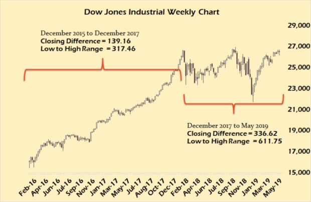 In case the picture itself is unclear, the numbers are. Since hitting a peak in January 2017 volatility as measured by the difference in closing prices week to week and the range of each week has more than doubled.