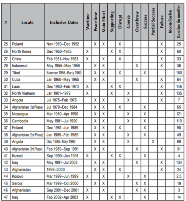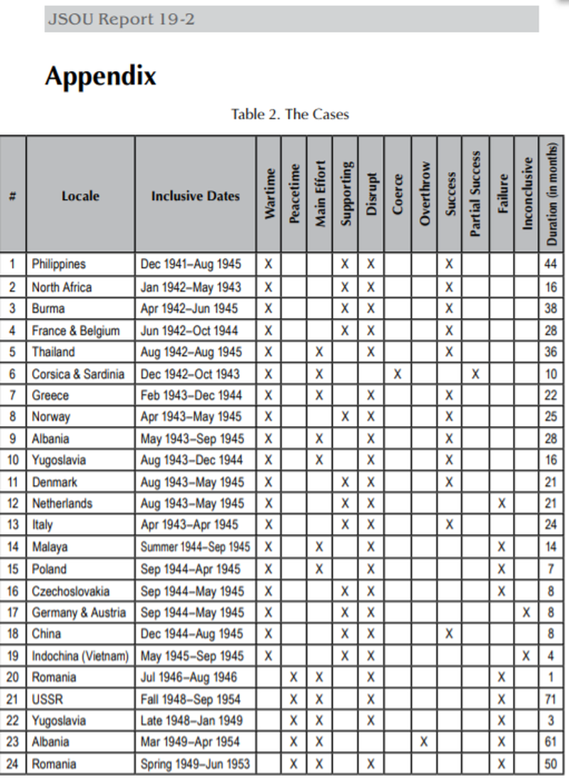 Other major findings included observations that most operations “were carried out under wartime conditions, with those being nearly twice as successful as cases conducted under peacetime conditions” and “support to nonviolent civil resistance seems to be more likely to succeed than support to armed resistance.” At the same time, they were also “most effective when conducted in direct support of a military campaign rather than as an independent or main effort operation.”