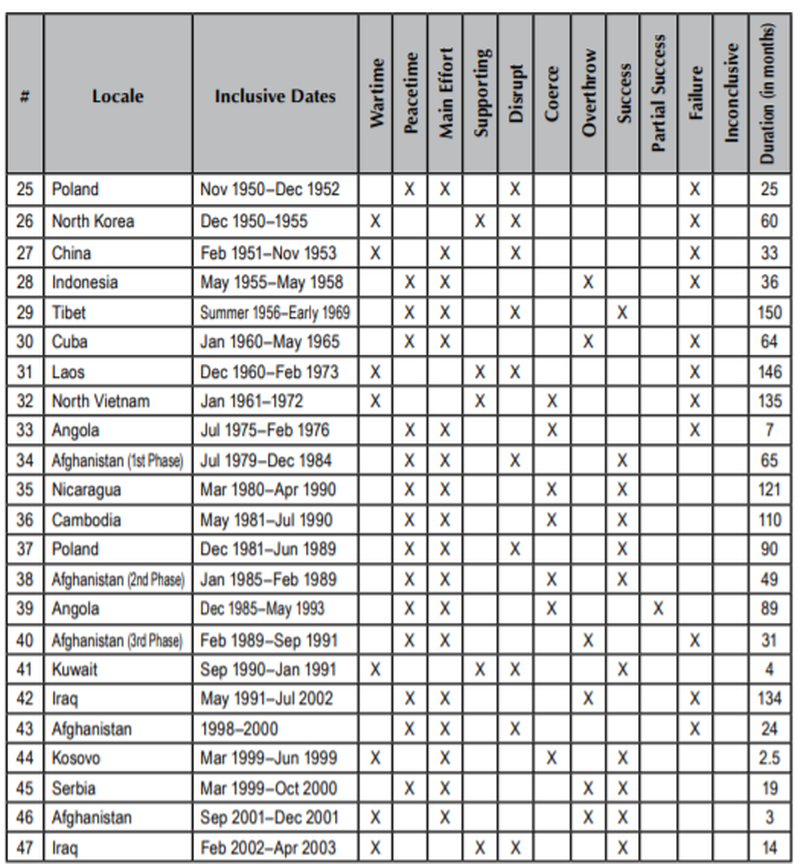Though infamous disasters such the abortive CIA-backed Bay of Pigs invasion of Cuba are highlighted, the US military report (perhaps predictably) finds that among those nearly fifty covert interventions surveyed, most interventions were “successful”.
