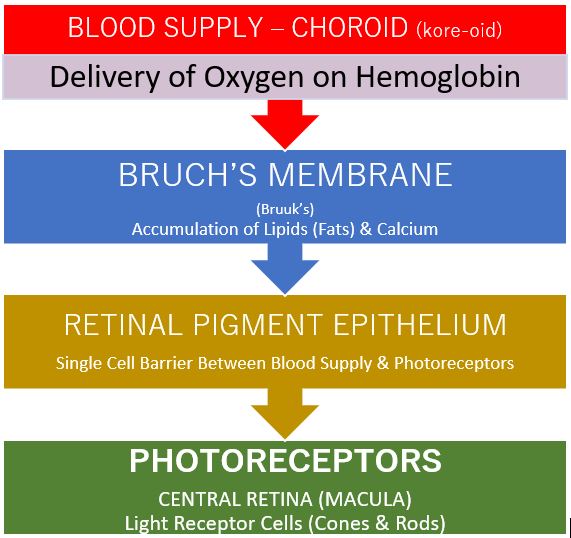 The blood supply layer of the retina (choroid) is separated from the light (photo) receptors by a thin cellophane-like film called Bruch’s (Bruuks’s) membrane and a single layer thick row of cells called the retinal pigment epithelium (RPE). Calcium and fats accumulate in Bruch’s membrane with advancing age. This membrane doubles in thickness from 2.0 microns to 4.7 microns over ten decades.