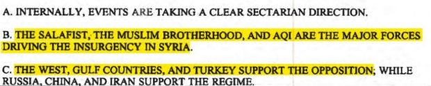 The below screenshot shows that extreme Muslim terrorists – salafists, Muslims Brotherhood, and AQI (i.e. Al Qaeda in Iraq) – have always been the “major forces driving the insurgency in Syria.”
