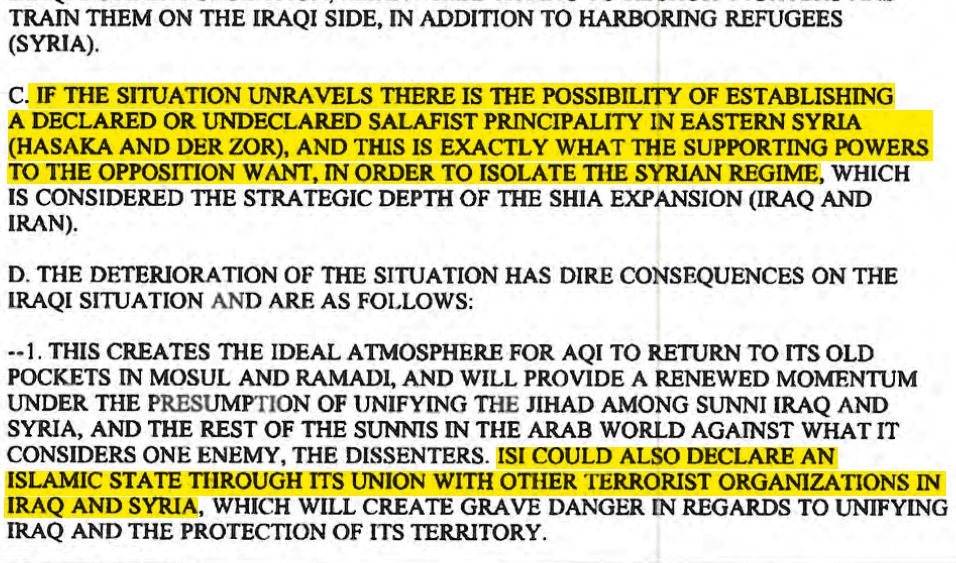 This shows how the powers that were supporting the Syrian opposition–the Western military alliance and their allies in the middle east–wanted an Islamic caliphate in order to challenge Syrian president Assad.