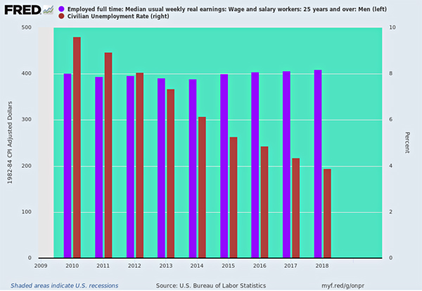 Since the recessionary jobs bottom in 2010, the unemployment rate (brown bars) has plunged from just under 10% to a 50-year low of 3.7% at present. Yet despite the apparent massive evacuation of labor “slack” from the US economic bathtub, real weekly earnings of prime age males (purple bars) have essentially flat-lined during the last eight years.