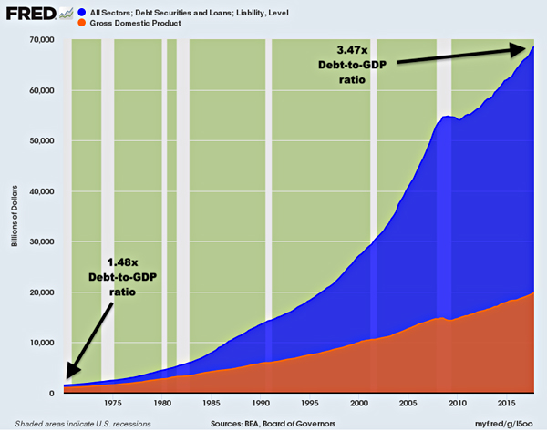 As shown below, there are now two turns of extra debt on the national income (3.47X versus 1.48X) compared to the long-standing leverage ratio which prevailed during the century between 1870 and 1970. In quantitative terms, those extra turns amount to $40 trillion of extra debt being lugged around by the US economy.